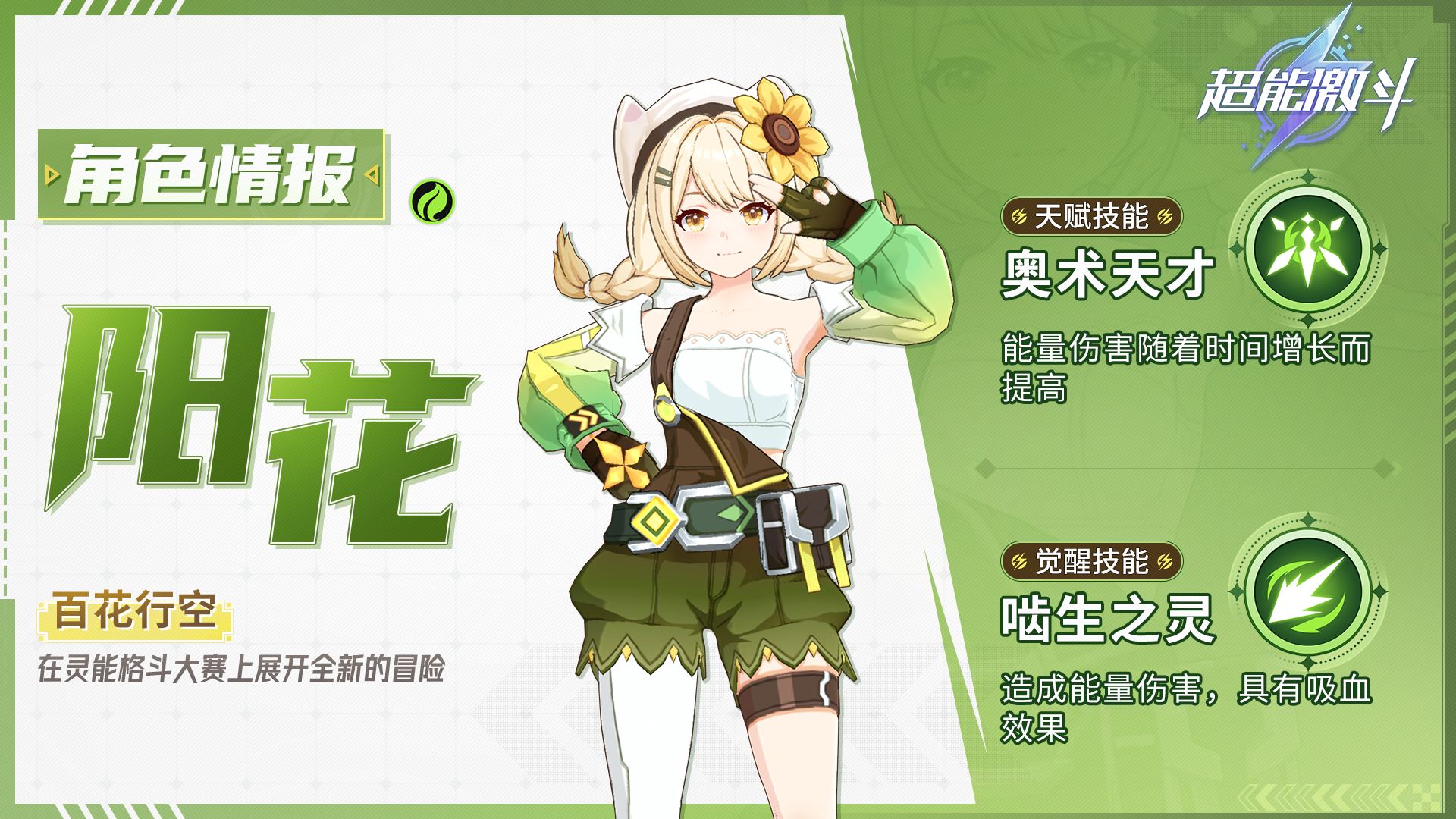 作为一位林系灵力型的灵能少女,阳花以她如向日葵般的阳光灵能,让对手在自然光辉的照耀下无处藏身,每次施法如同金色葵海在晨光中轻轻摇曳,温暖而充满力量。