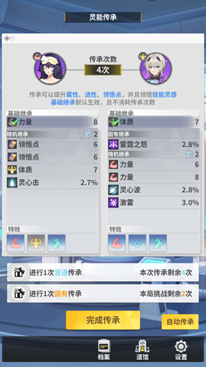 (3)传承少女将在获取时根据基础继承类型分为力量传承、耐力传承、体质传承、灵力传承、敏捷传承、招式传承,每局【新星杯】最多选择每种类型传承各1个;