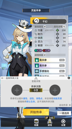 (5)新增“传承升阶”功能,对传承少女进行升阶将大幅度提升其基础继承效果并有概率提升或获取其他继承效果;