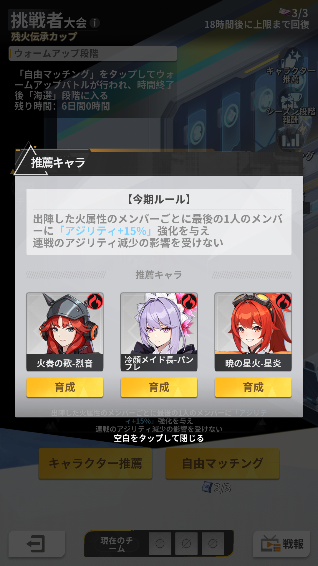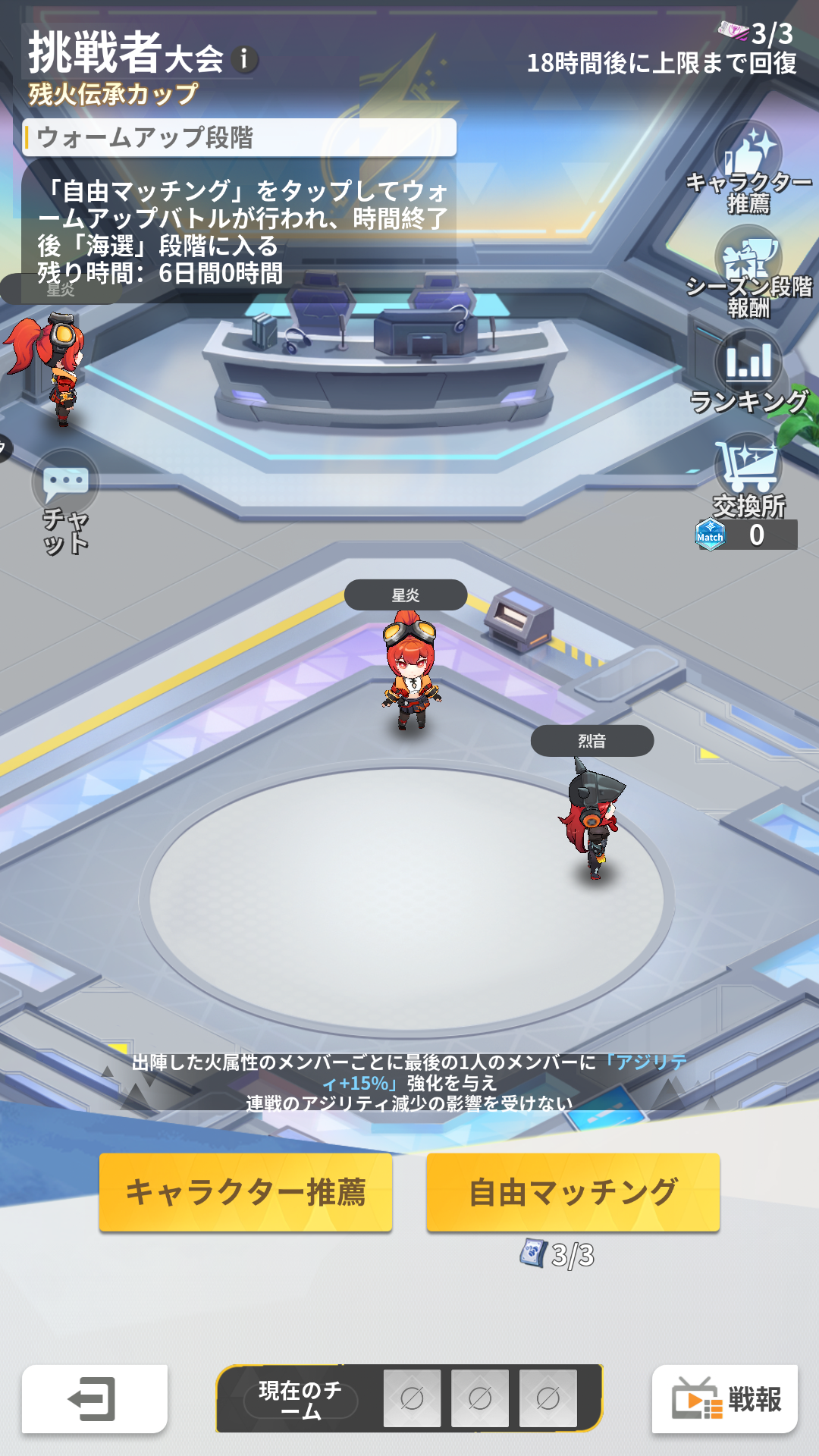 1日3回出場可能(1回あたり5連戦、同グループ内マッチング)