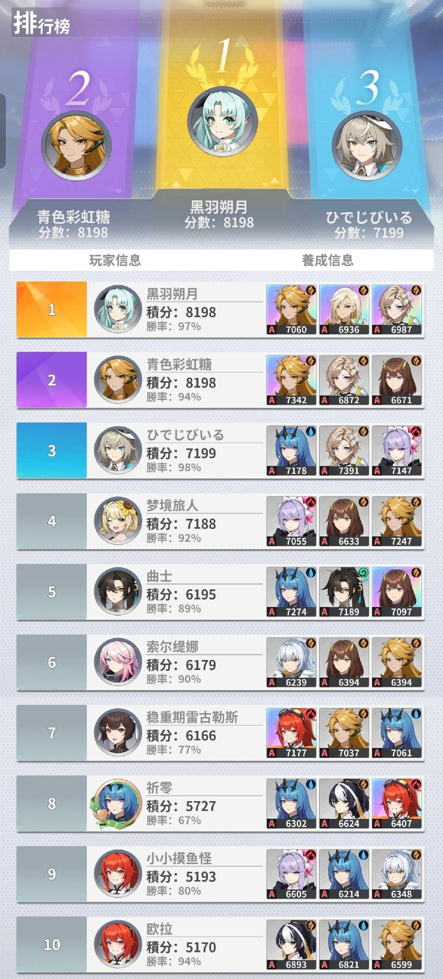 【黑羽朔月】と【青色彩虹糖】が8198ポイントの圧倒的スコアで首位を分け合いました。【ひでじびいる】は7199ポイントを獲得し、【梦境旅人】をわずか11ポイント差で振り切り3位を獲得。さらに、トップ10中最も高い勝率を記録しています。