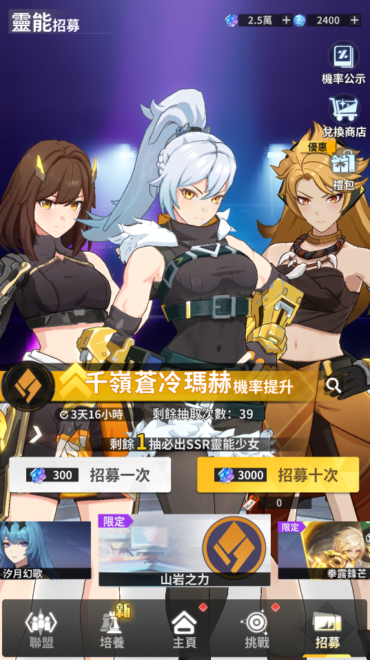 (3)【千嶺】、【瑪赫】、【蒼冷】平分所在的稀有度的50%招募機率,其他靈能少女平分剩餘機率。